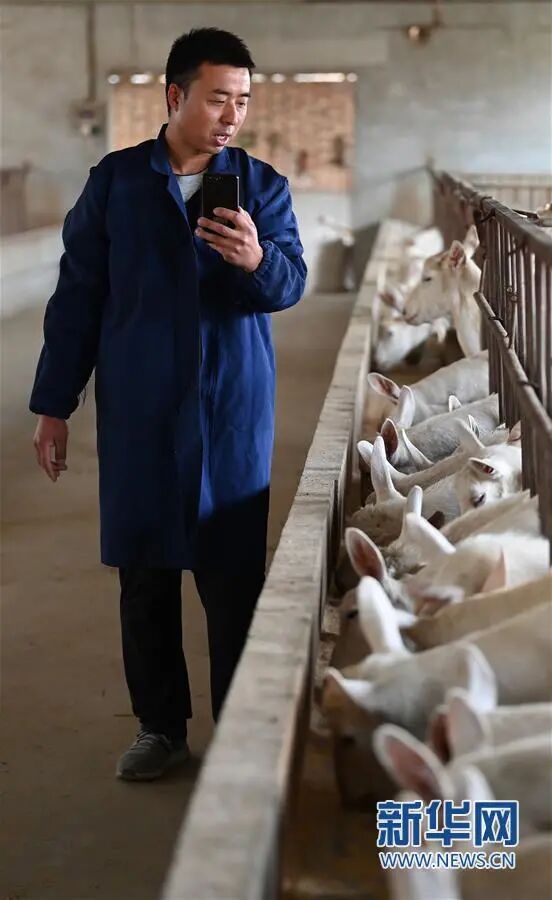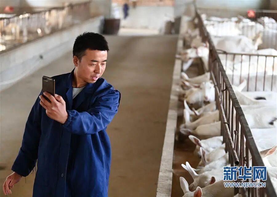 11月3日,陕西省富平县流曲镇双杨村村民向斌在羊圈旁播发短视频。在向斌开设的个人短视频平台账号上,除了家人日常生活的视频,主要是他喂养、销售奶山羊的视频。向斌说,短视频平台已成为他拓宽销路的重要渠道,最近好几单生意都是这样谈成的。