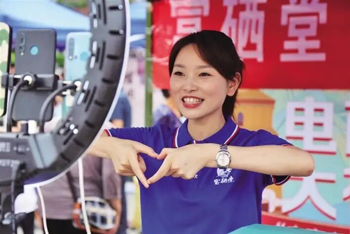 面对镜头,销售人员直播带货,以此促进市民消费,助力脱贫。