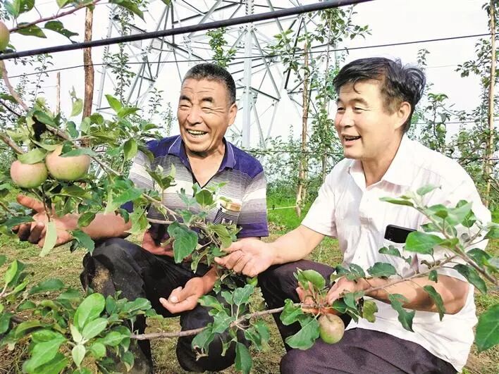 看着自家地里的苹果长势旺盛,杨天军(左一)按捺不住心中的喜悦。